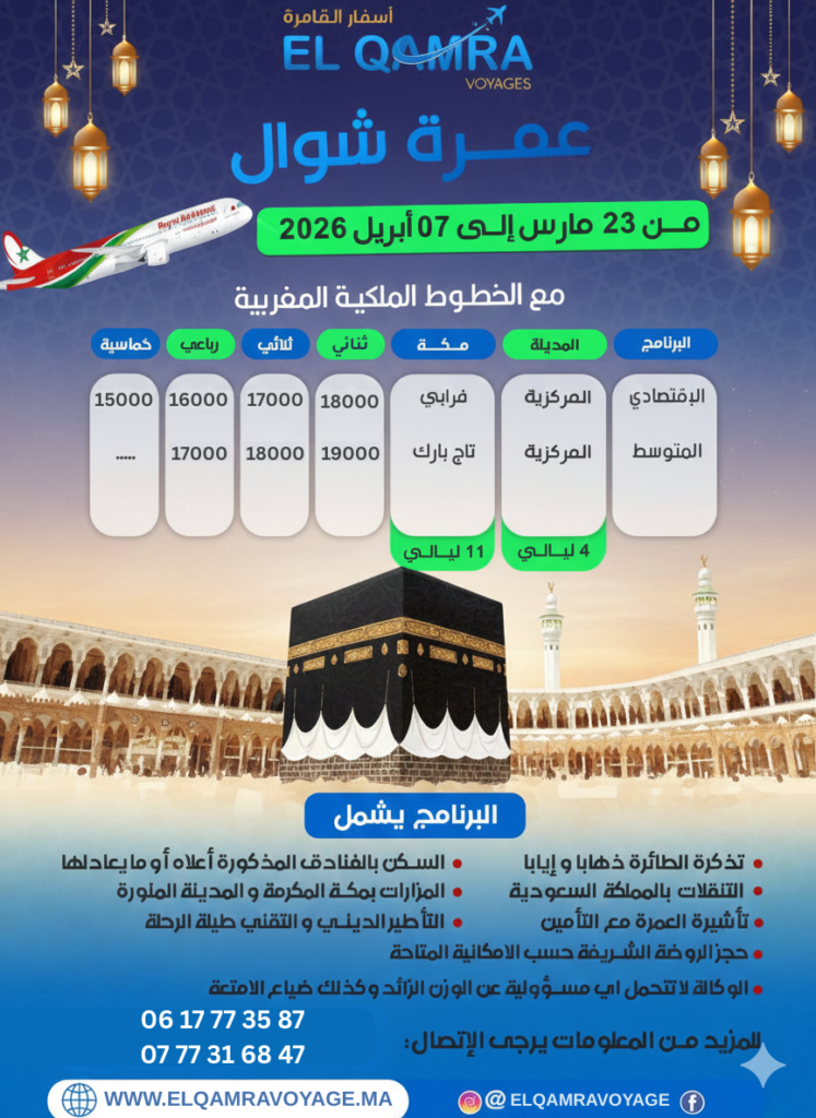 عمرة شوال طيران مباشر من23 مارس الى 07 ابريل 2026 18 Days Gallery Overview Cost HighlightsHôtels ✈️ تذاكر الطيران🏨 الفنادق🛂 تأشيرة العمرة 🕌 مرافقة دينية وتقنية طوال الرحلة🕌 حجز الروضة الشريفة حسب التوفر📍 زيارات للأماكن المقدسة في المدينة المنورة ومكة المكرمة الوكالة غير مسؤولة عن الوزن الزائد أو فقدان الأمتعة. Date & Time Package Type Back Continue Vous pouvez envoyer votre demande via le formulaire ci-dessous. Titre du voyage : * عمرة شوال طيران مباشر من23 مارس الى 07 ابريل 2026 Your name: * Your email: * Country * CHOISISSEZ UN PAYSAfghanistanÅland IslandsAlbaniaAlgeriaAmerican SamoaAndorraAngolaAnguillaAntarcticaAntigua and BarbudaArgentinaArmeniaArubaAustraliaAustriaAzerbaijanBahamasBahrainBangladeshBarbadosBelarusBelgiumBelauBelizeBeninBermudaBhutanBoliviaBonaire, Saint Eustatius and SabaBosnia and HerzegovinaBotswanaBouvet IslandBrazilBritish Indian Ocean TerritoryBruneiBulgariaBurkina FasoBurundiCambodiaCameroonCanadaCape VerdeCayman IslandsCentral African RepublicChadChileChinaChristmas IslandCocos (Keeling) IslandsColombiaComorosCongo (Brazzaville)Congo (Kinshasa)Cook IslandsCosta RicaCroatiaCubaCuraçaoCyprusCzech RepublicDenmarkDjiboutiDominicaDominican RepublicEcuadorEgyptEl SalvadorEquatorial GuineaEritreaEstoniaEthiopiaFalkland IslandsFaroe IslandsFijiFinlandFranceFrench GuianaFrench PolynesiaFrench Southern TerritoriesGabonGambiaGeorgiaGermanyGhanaGibraltarGreeceGreenlandGrenadaGuadeloupeGuamGuatemalaGuernseyGuineaGuinea-BissauGuyanaHaitiHeard Island and McDonald IslandsHondurasHong KongHungaryIcelandIndiaIndonesiaIranIraqIrelandIsle of ManIsraelItalyIvory CoastJamaicaJapanJerseyJordanKazakhstanKenyaKiribatiKuwaitKyrgyzstanLaosLatviaLebanonLesothoLiberiaLibyaLiechtensteinLithuaniaLuxembourgMacaoNorth MacedoniaMadagascarMalawiMalaysiaMaldivesMaliMaltaMarshall IslandsMartiniqueMauritaniaMauritiusMayotteMexicoMicronesiaMoldovaMonacoMongoliaMontenegroMontserratMoroccoMozambiqueMyanmarNamibiaNauruNepalNetherlandsNew CaledoniaNew ZealandNicaraguaNigerNigeriaNiueNorfolk IslandNorthern Mariana IslandsNorth KoreaNorwayOmanPakistanPalestinian TerritoryPanamaPapua New GuineaParaguayPeruPhilippinesPitcairnPolandPortugalPuerto RicoQatarReunionRomaniaRussiaRwandaSaint BarthélemySaint HelenaSaint Kitts and NevisSaint LuciaSaint Martin (French part)Saint Martin (Dutch part)Saint Pierre and MiquelonSaint Vincent and the GrenadinesSan MarinoSão Tomé and PríncipeSaudi ArabiaSenegalSerbiaSeychellesSierra LeoneSingaporeSlovakiaSloveniaSolomon IslandsSomaliaSouth AfricaSouth Georgia/Sandwich IslandsSouth KoreaSouth SudanSpainSri LankaSudanSurinameSvalbard and Jan MayenSwazilandSwedenSwitzerlandSyriaTaiwanTajikistanTanzaniaThailandTimor-LesteTogoTokelauTongaTrinidad and TobagoTunisiaTurkeyTurkmenistanTurks and Caicos IslandsTuvaluUgandaUkraineUnited Arab EmiratesUnited Kingdom (UK)United States (US)United States (US) Minor Outlying IslandsUruguayUzbekistanVanuatuVaticanVenezuelaVietnamVirgin Islands (British)Virgin Islands (US)Wallis and FutunaWestern SaharaSamoaYemenZambiaZimbabwe Contact number: * No. of Adults * No. of children Enquiry Subject: * Your Message * Send Email Show Prices 17% Off From د.م.18.000 د.م.15.000 / غرفة خماسية Check Availability
